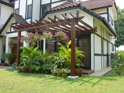 欧式庭院的设计,葡萄架下面种着盆栽,打开家门就能呼吸到新鲜空气。